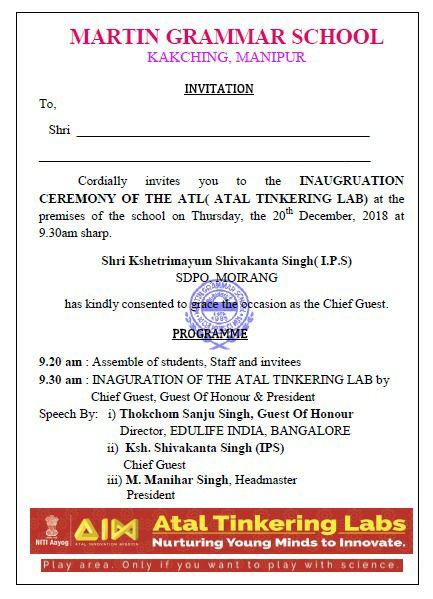 Invitation for Inaugural Function of #AtalTinkeringLab